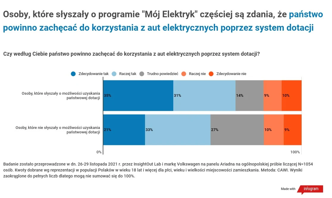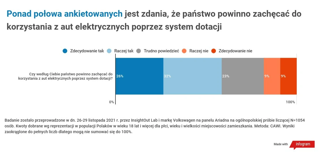 Z badania marki Volkswagen i InsightOut Labu wynika, że system dotacji cieszy się poparciem ponad połowy ankietowanych. W sumie 58% badanych uważa, że państwo powinno zachęcać do korzystania z aut elektrycznych w ten sposób. Tylko 18% jest przeciwnego zdania. Natomiast aż niemal ¼ badanych nie ma w tej sprawie opinii.