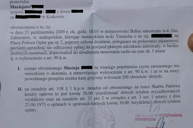 Sąd uznał, że było to celowe działanie, a motocyklista nie miał odliczonej kwoty więc popełnił wykroczenie art. 90 k.w. W pisemnym uzasadnieniu znalazło się stwierdzenie doprowadził do utrudnienia tamowania ruchu. To tak, jakby motocyklista swym zachowaniem miał utrudnić życie innym motocyklistom chcącym blokować bramki poboru opłat.