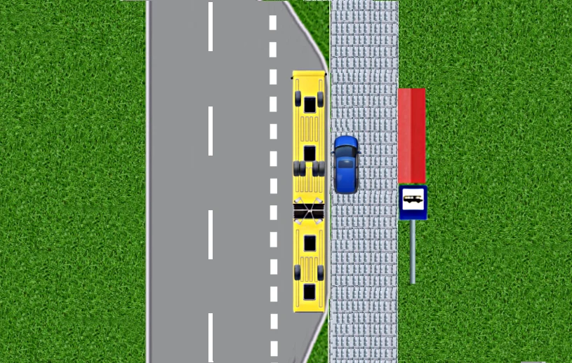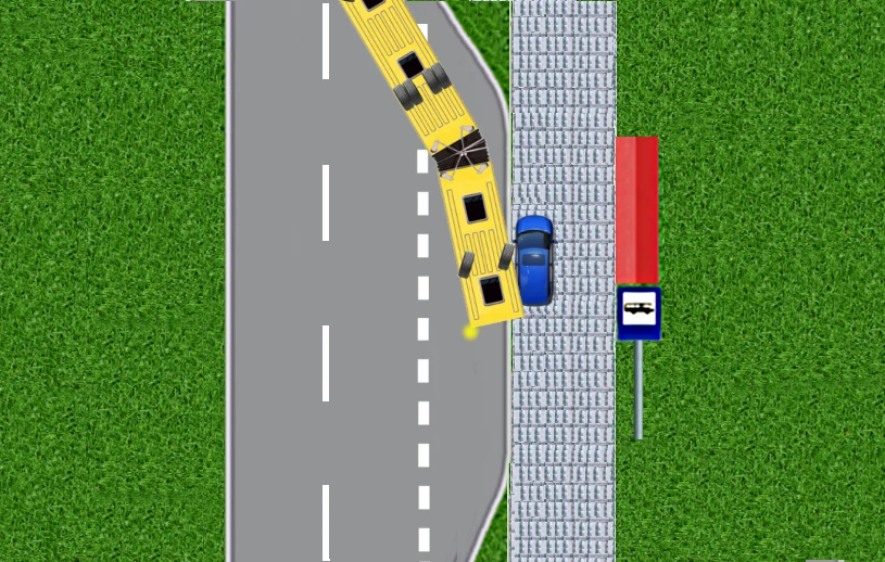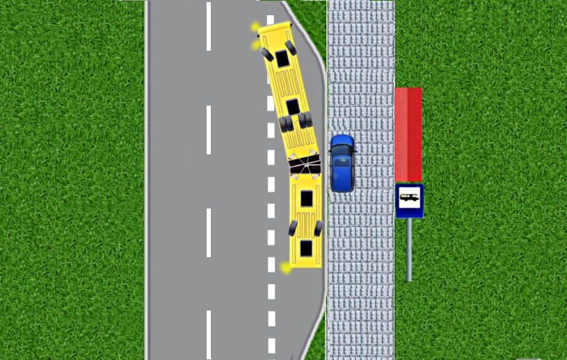 W chwili, kiedy kierowca autobusu zaczyna skręcanie, tylne koła przyczepy tego pojazdu odchylają się w lewo. Grozi to oczywiście uderzeniem w auto stojące na sąsiednim pasie: