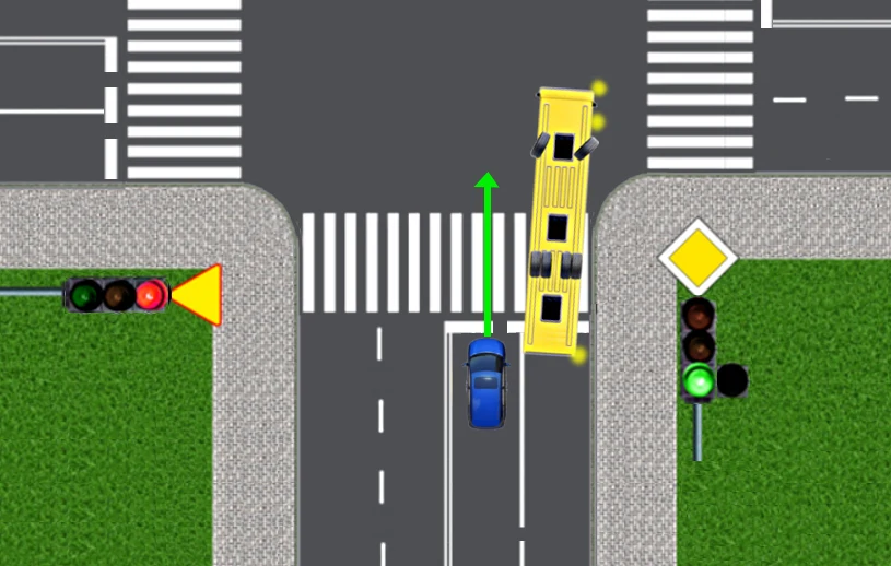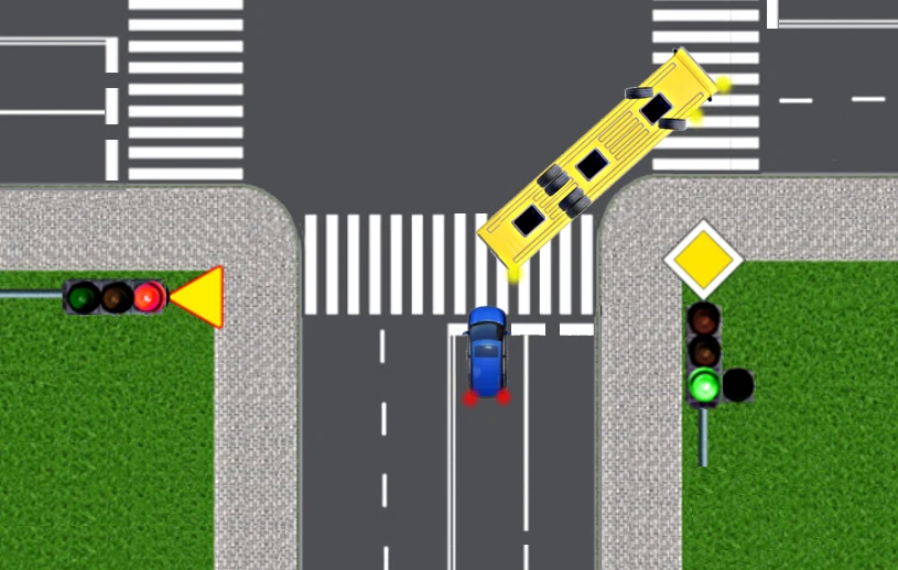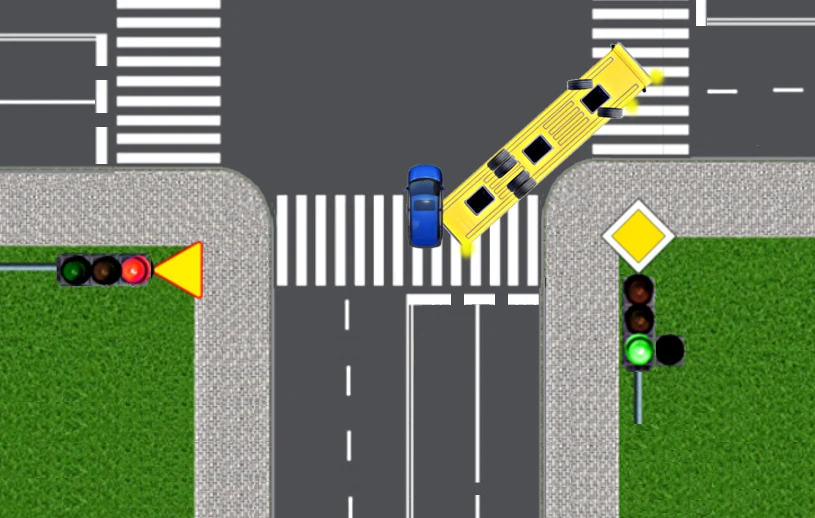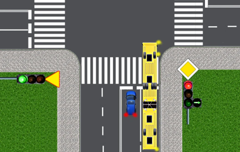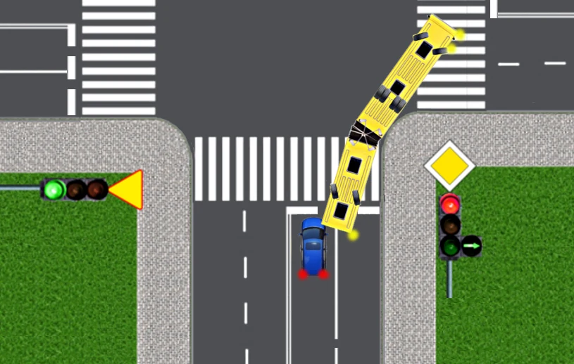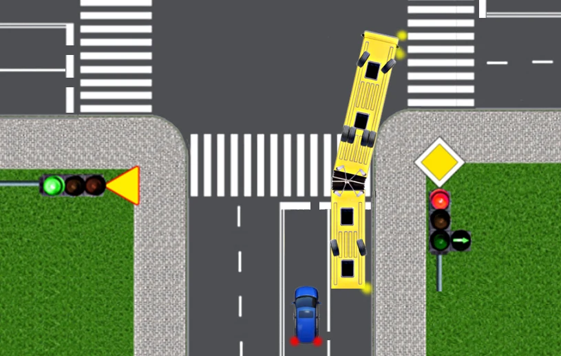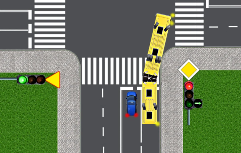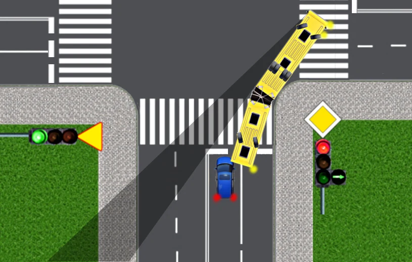 Autobus przegubowy przystępuje do skręcania w prawo na skrzyżowaniu. Musi jednak ustąpić pierwszeństwa pojazdom na drodze poprzecznej. W chwili, gdy autobus zatrzymuje się, jest "złamany", tzn. część przednia i tylna przegubowca ustawione są względem siebie pod kątem około 30 stopni. Zwróćcie uwagę, że w tym momencie kierowca autobusu nie widzi już w lusterku wstecznym pojazdów znajdujących się na sąsiednim pasie ruchu, z tyłu autobusu.
