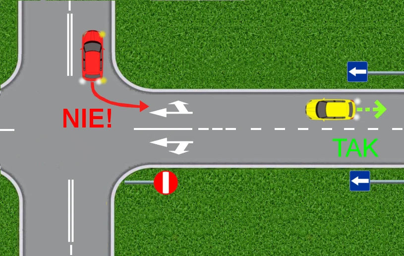 Czerwony samochód w żadnym razie nie ma prawa wjeżdżać w ten sposób, od strony zakazu wjazdu, na jezdnię jednokierunkową. Zdarzają się cwaniacy, którzy tak właśnie postępują.