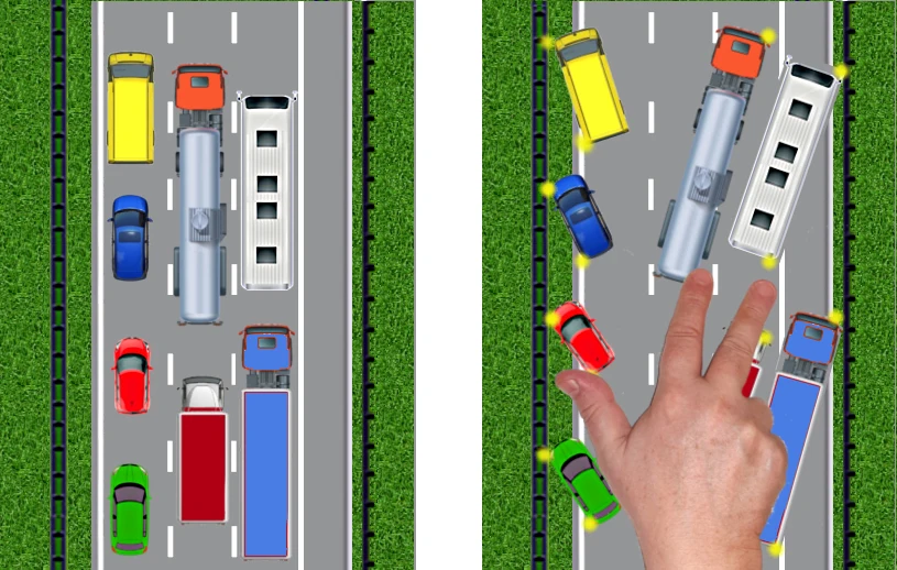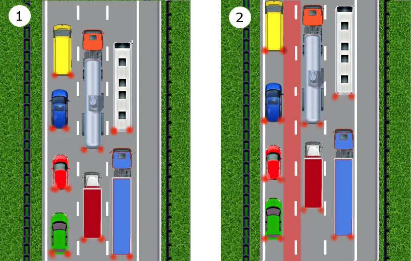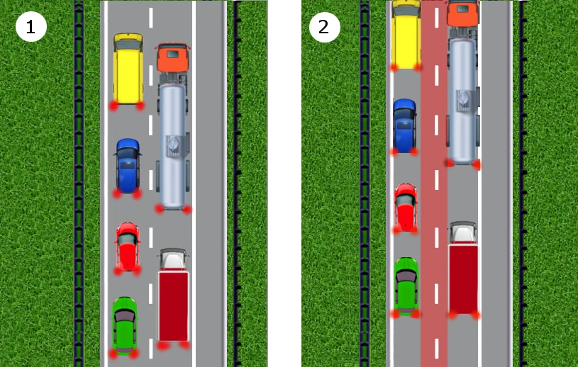 Kierowcy pojazdów znajdujących się na pasach środkowym i prawym powinni ze sobą zgodnie współpracować, bo dopóki kierujący na prawym pasie nie usunie się w prawo, ten na środkowym nie będzie mógł nic zrobić: