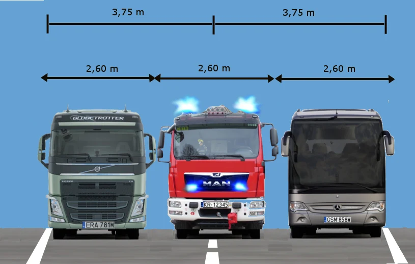 Szerokość pasów ruchu na autostradach wynosi maksymalnie 3,75 m. W przypadku autostrady o dwóch pasach ruchu dla tego samego kierunku szerokość jezdni wyniesie zatem 3,75 m + 3,75 m = 7,5 m plus ok. 0,15 m (szerokość linii przerywanej oddzielającej pasy ruchu). A teraz popatrzcie, ile wynosi szerokość dużego autobusu lub ciężarówki. Może ona sięgać wraz z lusterkami 2,60 m. Oznacza to, że jeśli nawet autobus i ciężarówka zjadą maksymalnie do krawędzi zajmowanych pasów ruchu, to szerokość utworzonego a ten sposób korytarza życia wyniesie zaledwie ok. 2,5 metra! Ile wynosi szerokość wozu bojowego straży pożarnej? Również ok. 2,60 m. Czyli taki korytarz życia dla dużego wozu pożarniczego oznacza przeciskanie się na milimetry, co na pewno nie umożliwi szybkiej jazdy na ratunek. A przecież nowe przepisy mają dotyczyć nie tylko autostrad, ale wszystkich dróg, a więc także miejskich arterii, na których pasy ruchu są znacznie węższe.