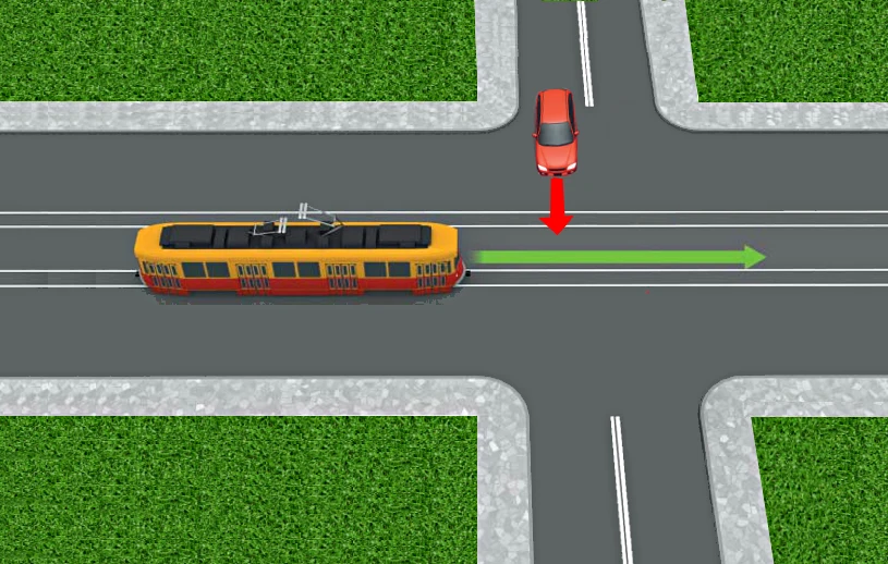 Kierujący czerwonym samochodem musi ustąpić pierwszeństwa tramwajowi nadjeżdżającemu z jego prawej strony.