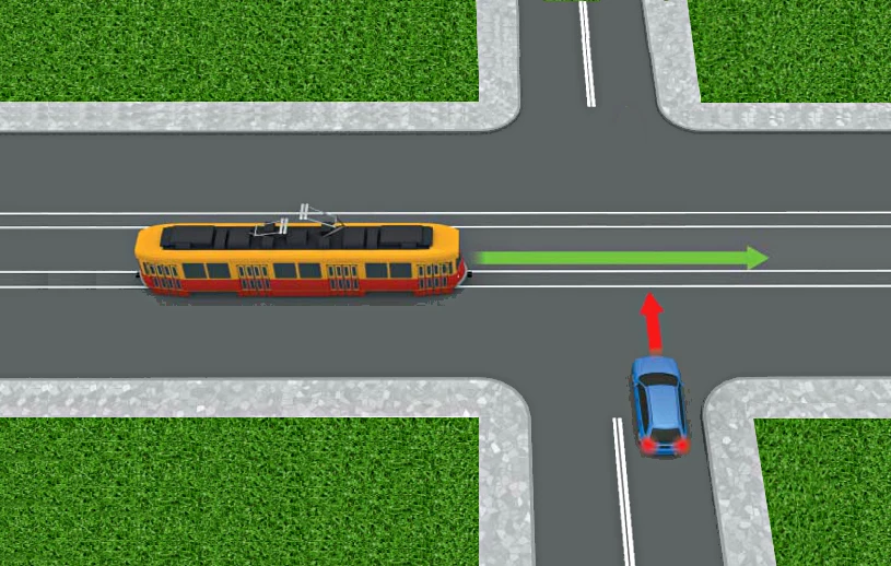 Kierujący niebieskim samochodem również musi ustąpić pierwszeństwa tramwajowi nadjeżdżającemu z jego lewej strony.