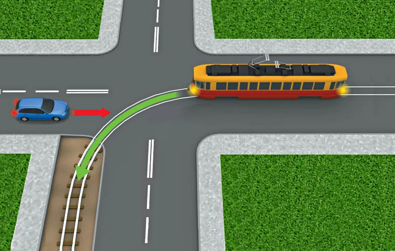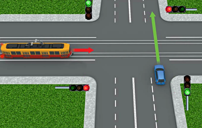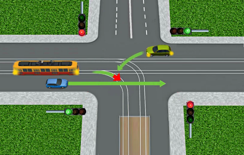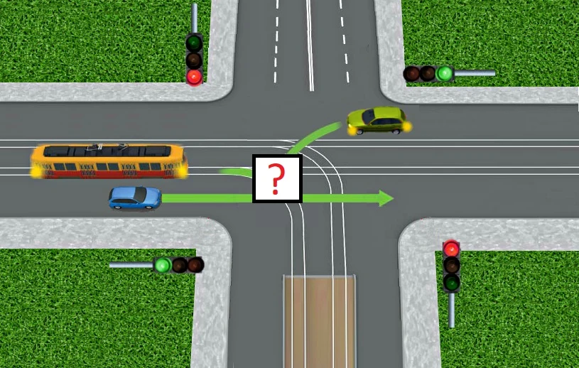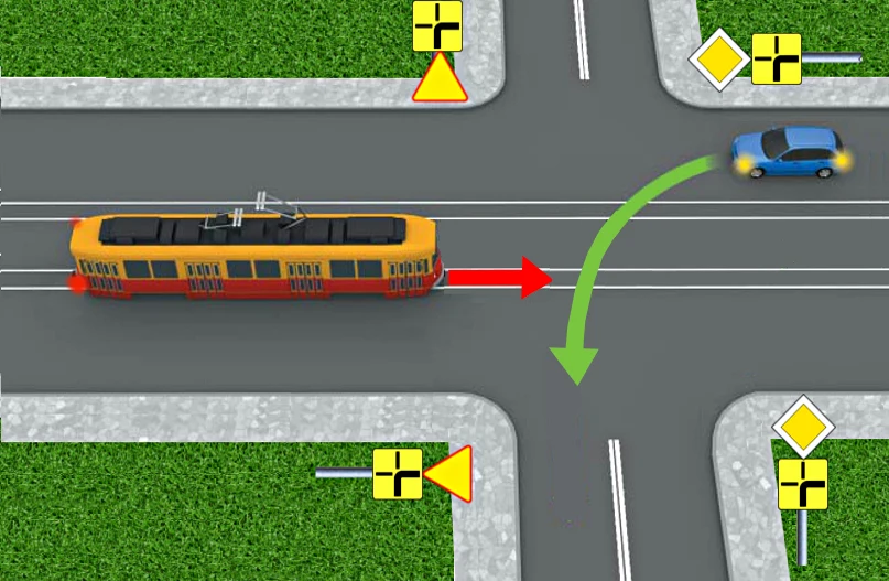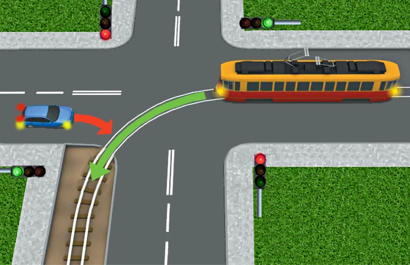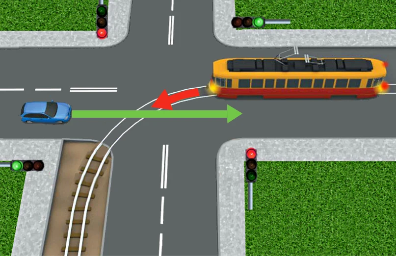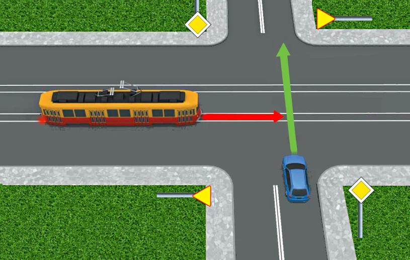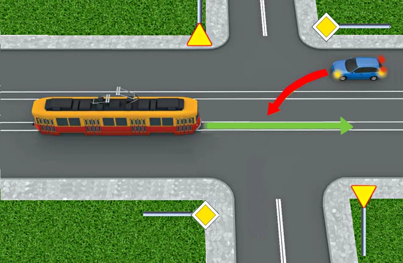 W takim przypadku skręcający w lewo samochód ma pierwszeństwo przed jadącym prosto tramwajem. Żadnego znaczenia nie ma tutaj okoliczność, że tramwaj jest pojazdem szynowym.