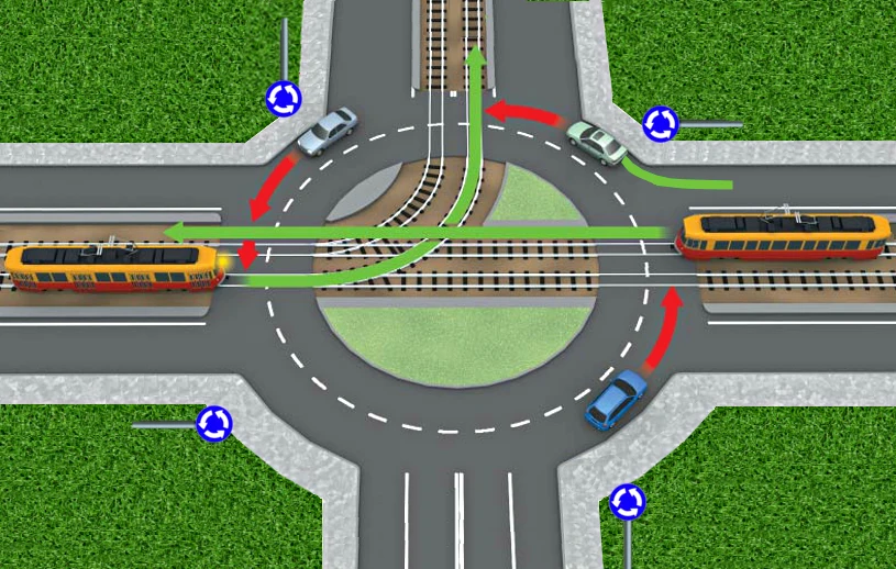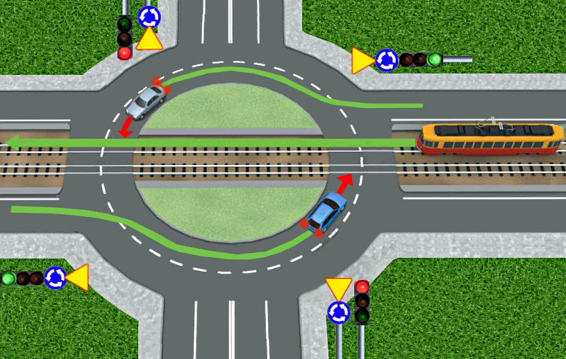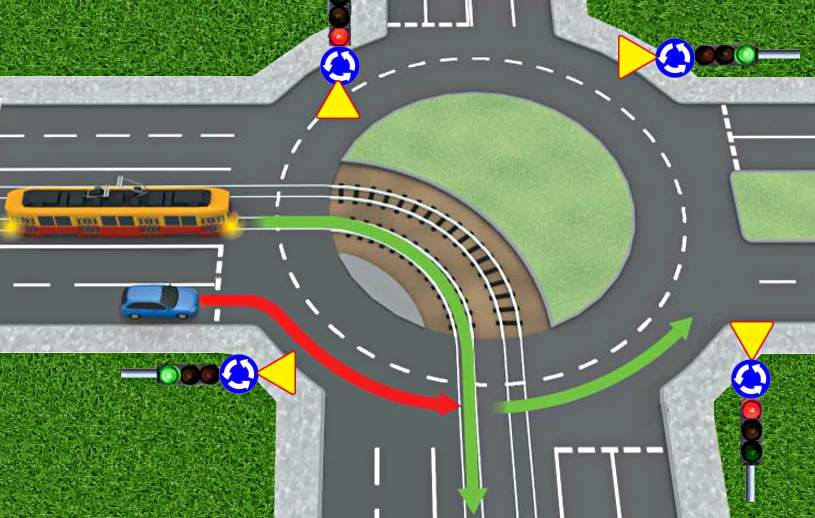 Zgodnie z tymi zasadami samochód jadący prosto przez rondo z sygnalizacją świetlną nie ma już pierwszeństwa przed skręcającym tramwajem (tak jak to było na zwykłym skrzyżowaniu).
