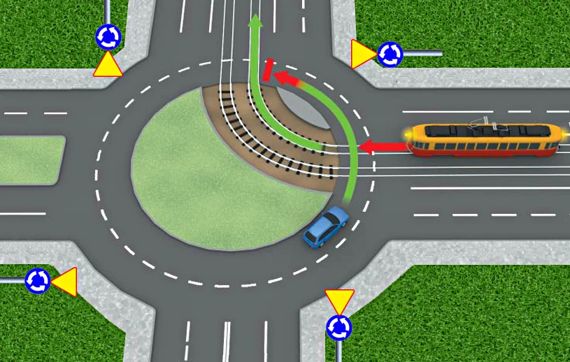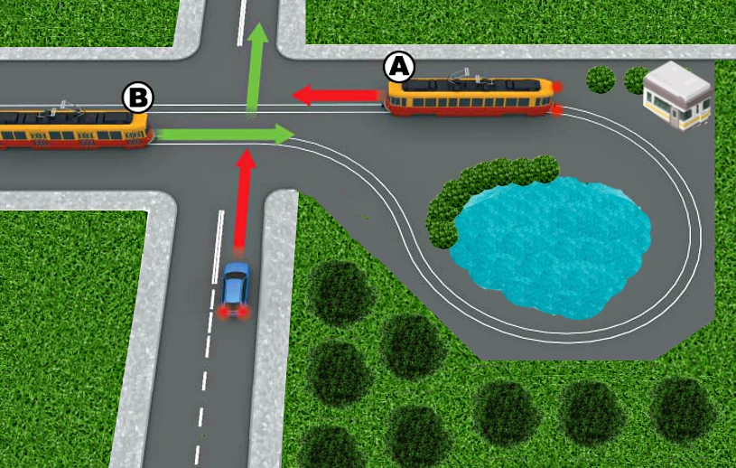 Istnieje jednak od tych reguł jeden wyjątek: jeżeli tramwaj wyjeżdża na drogę z zajezdni lub z pętli, wówczas włącza się do ruchu. W takiej sytuacji pierwszeństwo mu nie przysługuję. Dlatego właśnie kierujący niebieskim samochodem ustępuje pierwszeństwa tramwajowi B wjeżdżającemu na pętlę, ale ma pierwszeństwo przed tramwajem A wyjeżdżającym z pętli.