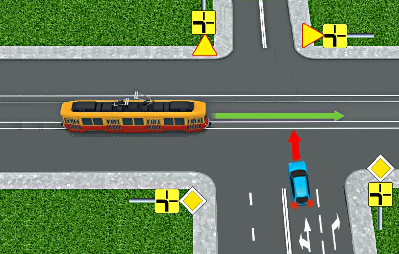 Ale uwagą! Jeżeli tramwaj i samochód na skrzyżowaniu ze znakami określającymi pierwszeństwo znajdują się w sytuacji równorzędnej (np. oba pojazdy są na drodze z pierwszeństwem lub oba na drodze podporządkowanej), to wówczas tramwaj znowu ma pierwszeństwo jako pojazd szynowy. Notabene w tym przypadku kierujący niebieskim samochodem, skręcając