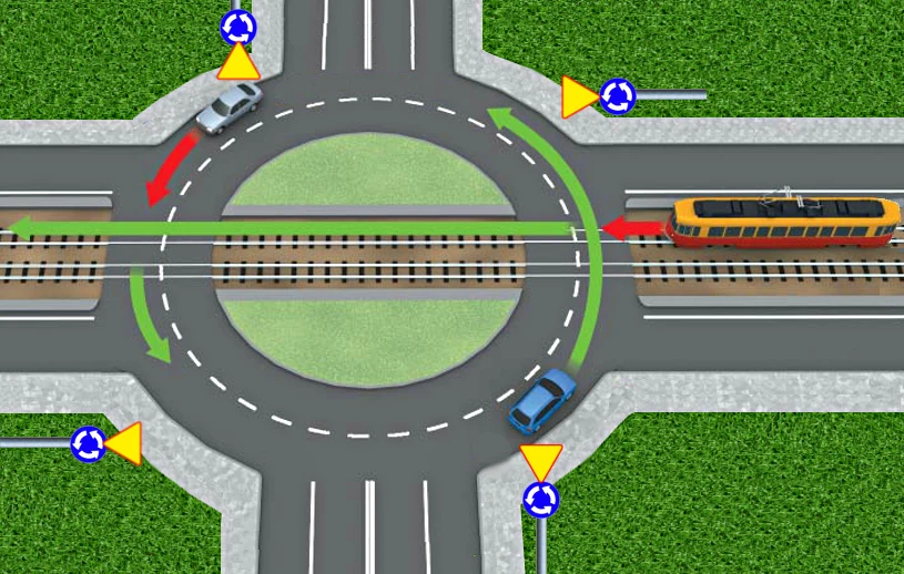 Na rondzie ze znakami "ustąp pierwszeństwa" na wlotach, obowiązuje nadrzędność wskazań znaków w stosunku do przepisów ruchu. A zatem tramwaj wjeżdżający na rondo musi ustąpić pierwszeństwa samochodowi, który jedzie po obwiedni ronda. Kiedy tramwaj znajdzie się już na rondzie, czyli w sytuacji równorzędnej z innymi pojazdami, wówczas "odzyskuje" swoje pierwszeństwo jako pojazd szynowy. Tak więc tramwaj zjeżdżający z wyspy ronda ma pierwszeństwo przed samochodami.