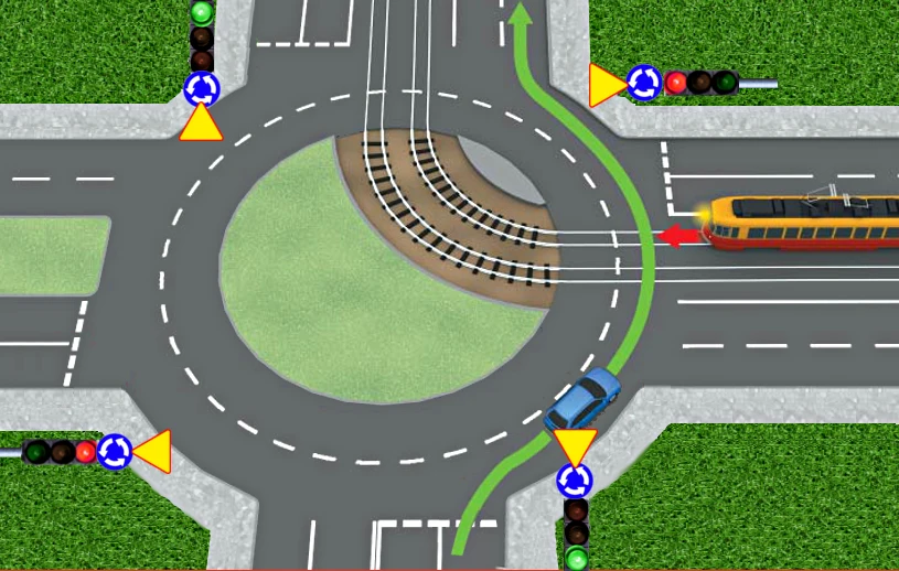 Wskazania sygnalizacji świetlnej obowiązują także kierującego tramwajem na rondzie. W tej sytuacji tramwaj nie może wjechać na rondo, musi czekać na sygnał zielony.