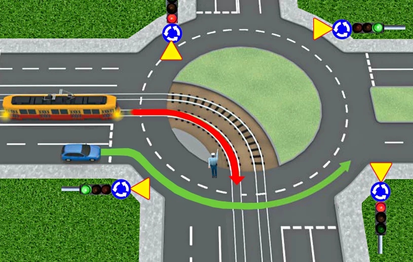 Na przykład w tej sytuacji policjant może nakazać motorniczemu tramwaju zatrzymanie się na wyspie podczas skręcania i umożliwienie jazdy przez rondo pozostałym pojazdom.