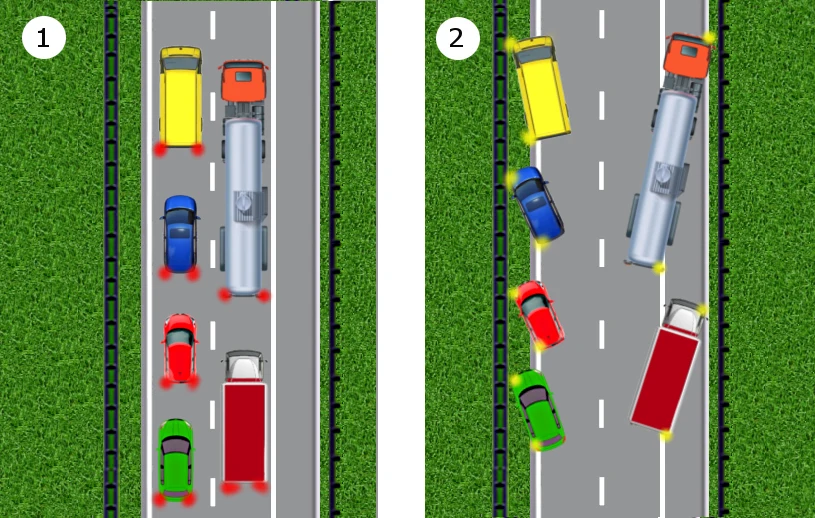 Samochody na lewym pasie powinny zjechać jak najdalej w lewo, wjeżdżając lewymi kołami na pas rozdzielający, pojazdy na prawym pasie powinny zjechać na pobocze, a samochody na pasie środkowym przejechać na prawy pas, jak najbliżej jego prawej krawędzi.