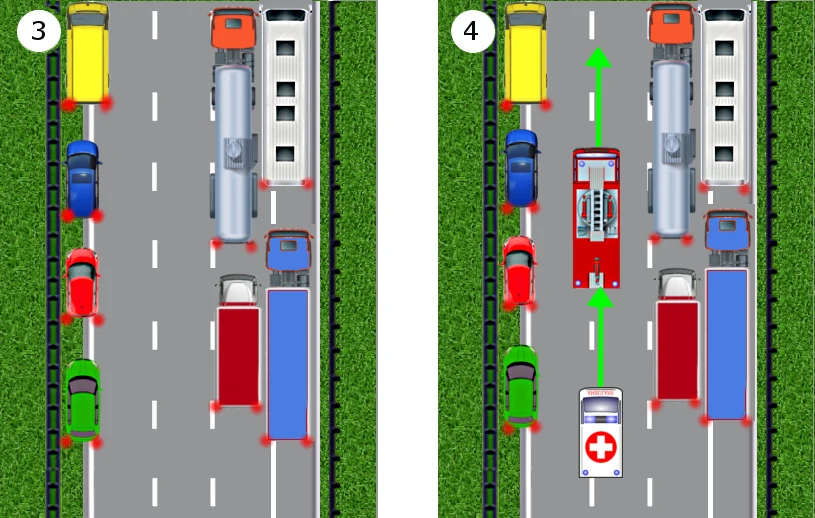 W sytuacji gdy doszło do wypadku na drodze szybkiego ruchu, samochody jadące lewym pasem jezdni powinny zjechać jak najbardziej w lewo, o ile to możliwe, na pas rozdzielający czy trawnik. Pojazdy jadące prawym pasem powinny z kolei zjechać maksymalnie w prawo, również na pobocze lub trawę, starając się zrobić jak najwięcej miejsca (pamiętajmy że choćby wozy bojowe straży pożarnej są naprawdę duże).
