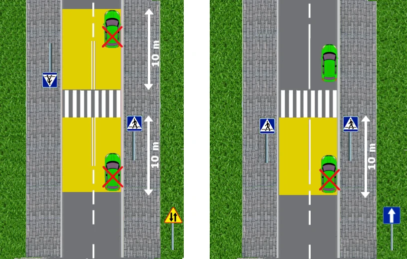 Jeżeli jezdnia jest dwukierunkowa i ma tylko po jednym pasie ruchu dla każdego kierunku, to zabronione jest zatrzymywanie pojazdu w odległości mniejszej niż 10 m od przejścia i to zarówno przed tym przejściem, jak i za nim. W pozostałych przypadkach przepisy zabraniają zatrzymania się w odległości mniejszej niż 10 m przed przejściem.