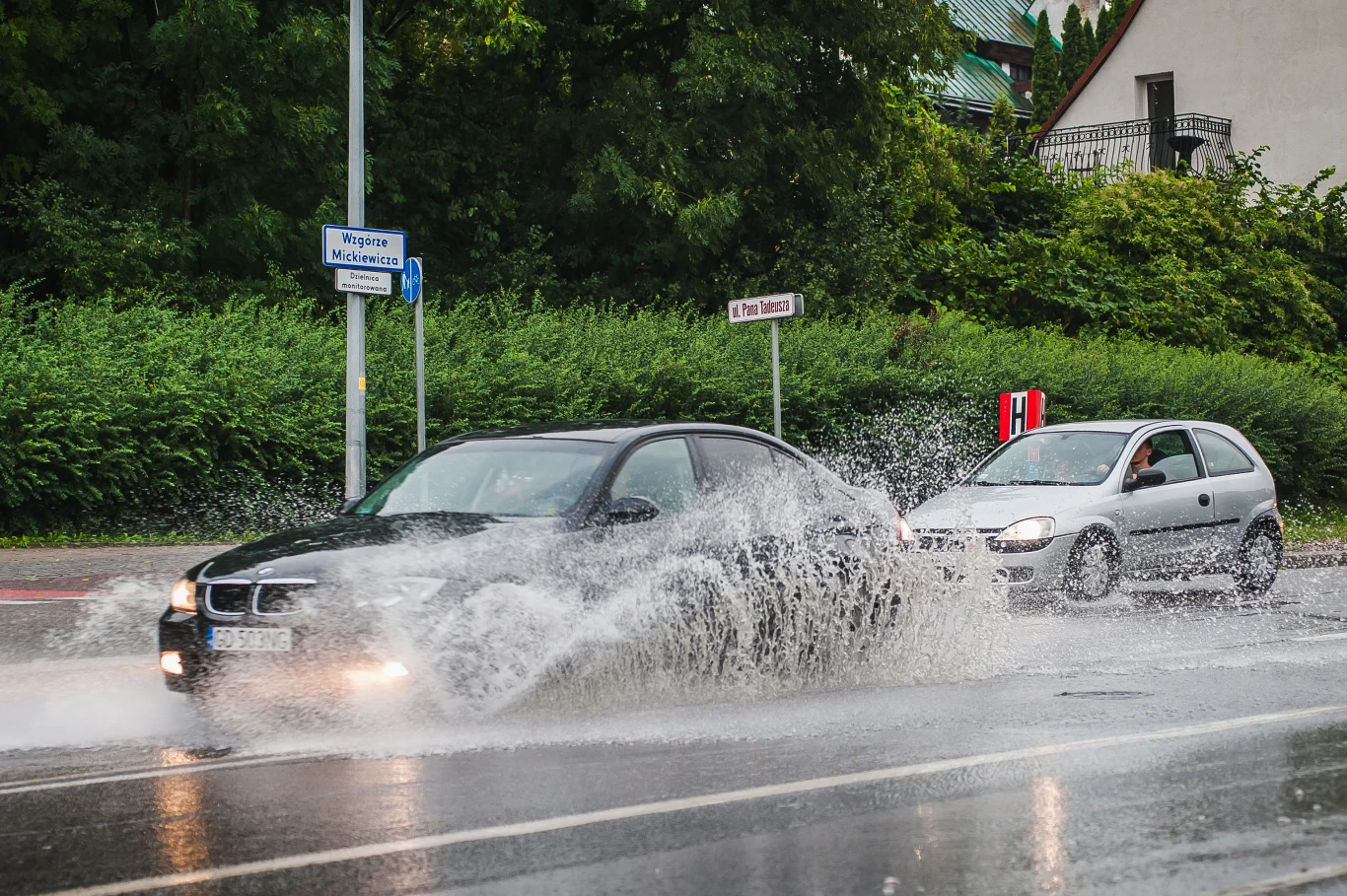 Wjeżdżanie w kałuże ze znaczną prędkością kryje w sobie jeszcze inne niebezpieczeństwo. Jeśli kałuża ma znaczną głębokość, wjechanie w nią może spowodować gwałtowne zmniejszenie prędkości pojazdu, co grozi utratą panowania nad nim. Co gorsza, może wystąpić zjawisko tzw. aquaplaningu czyli poślizgu wodnego. Jeśli bieżnik opon przestanie nadążać odprowadzać wodę, auto popłynie na klinie wodnym i stanie się wówczas zupełnie niesterowalne. Nic nie pomoże kręcenie kierownicą ani hamowane. Samochód będzie podążał w niezależnym od was kierunku i istnieje możliwość, że zatrzymacie się dopiero na latarni. Zjawisko aquaplaningu może wystąpić już przy prędkości 60-70 km/h. Albo przy niższej - wszystko zależy od głębokości kałuży i stanu waszych opon.