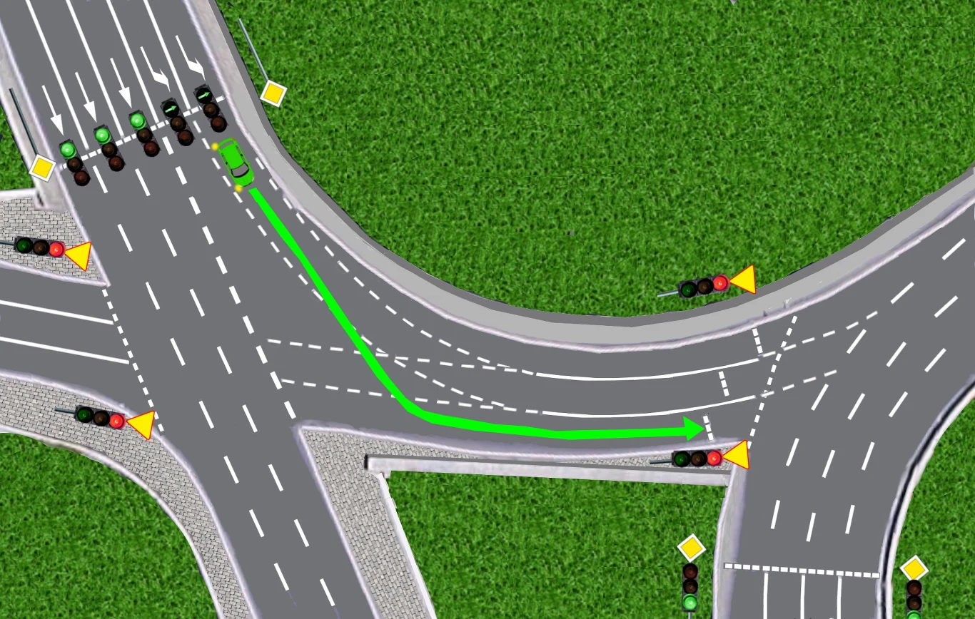 Użycie lewego kierunkowskazu będzie natomiast w pełni uzasadnione, jeżeli kierowca zielonego samochodu zamierza zmienić pas ruchu, tzn. przejechać na skrajny wewnętrzny pas rozpoczynający się za sygnalizatorem.