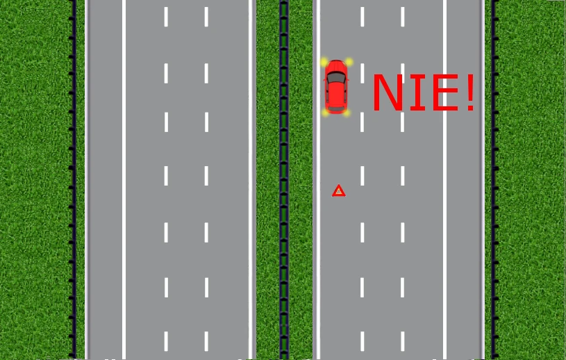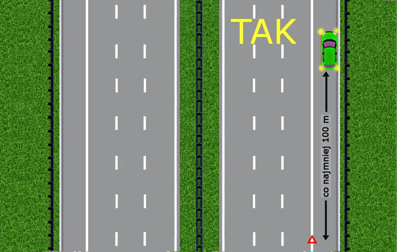 Już w chwili zauważenia awarii włącz światła awaryjne i staraj się zjechać na prawe pobocze, możliwie jak najbliżej bariery. Ale bez paniki! Nie możesz zajechać drogi innemu autu! Natychmiast po zatrzymaniu samochodu wysiądź z niego ostrożnie, załóż kamizelkę odblaskową, weź trójkąt ostrzegawczy i ustaw go w odległości co najmniej 100 metrów za twoim samochodem. To jest około 150 kroków. Idź z trójkątem obserwując uważnie nadjeżdżające samochody i bądź przygotowany do uskoczenia na bok, gdyby zagrażało ci niebezpieczeństwo. Najlepiej jednak idź za barierą. Trójkąt trzymaj przed sobą, aby inni kierowcy wiedzieli, dlaczego idziesz po poboczu. Ustaw trójkąt na linii krawędziowej oddzielającej jezdnię od pobocza, a nie przy barierze.