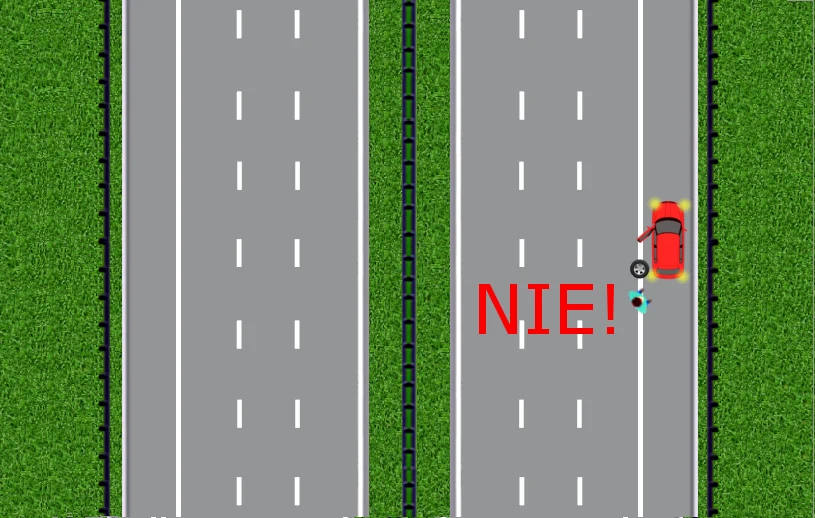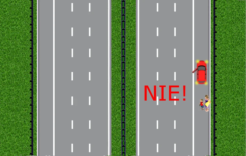 Nie otwieraj nieostrożnie drzwi od strony jezdni! Nie pozwalaj swoim pasażerom wysiadać w sposób niekontrolowany z auta. Mogą wysiadać tylko za twoją zgodą albo na twoje polecenie. Nigdy nie wolno stać za samochodem. Jeżeli jakiś pojazd wpadnie na pobocze, zostaniecie zmiażdżeni!