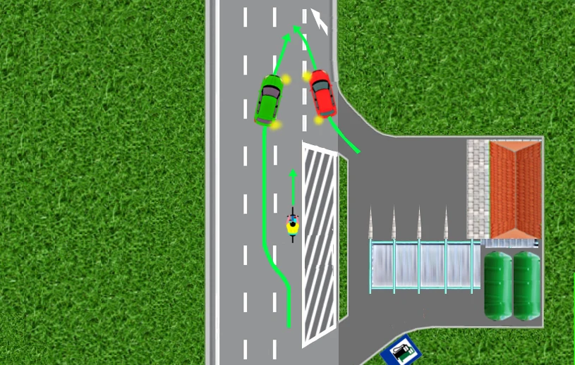 A zatem nie ma tu zastosowania przepis określający pierwszeństwo przy zmianie pasa ruchu. Kierujący czerwonym samochodem nie ma pierwszeństwa, bo włącza się do ruchu. To jedno z podobno trudnych pytań egzaminacyjnych.