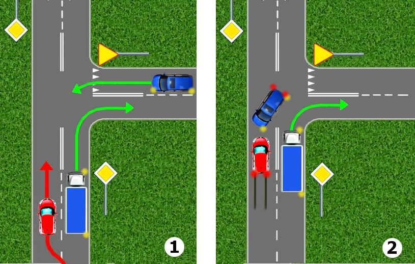 Kierowca czerwonego samochodu dostrzega przed sobą jadącą powoli ciężarówkę, która w dodatku prawym kierunkowskazem sygnalizuje zamiar skręcenia. Kierowca osobówki nie zastanawia się i podejmuje wyprzedzanie tej ciężarówki zupełnie nie zwracając uwagi na to, że zbliża się do skrzyżowania. A przecież informuje o tym nie tylko znak pionowy "droga z pierwszeństwem", ale także ostrzegawcza linia przerywana (z krótkimi przerwami) wyznaczająca oś jezdni, która potem przechodzi w linię podwójną ciągłą.
