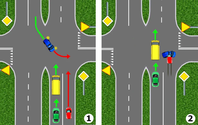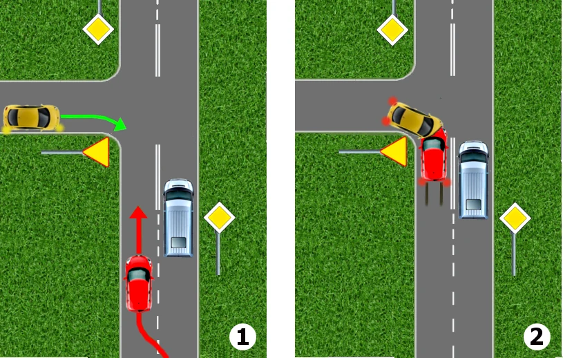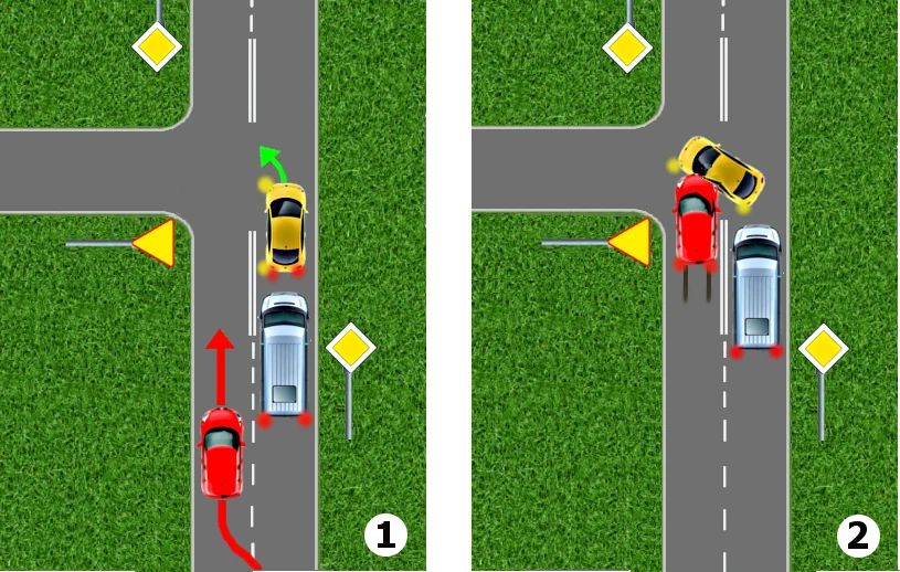 Kierowca żółtego samochodu zbliża się do skrzyżowania drogą podporządkowaną. Zamierza na skrzyżowaniu skręcić w prawo. Spogląda zatem w lewo, nie zauważa żadnego nadjeżdżającego z tamtej strony pojazdu i rozpoczyna skręcanie. Nagle dostrzega pędzący wprost na niego czerwony samochód.