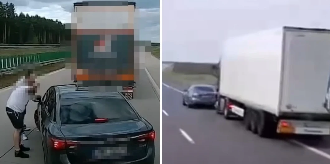 W tej sytuacji kierowca BMW spieszy się tak bardzo, że wyprzedza ciężarówkę poboczem. Wystarcza mu jednak czasu, aby zaraz złośliwie hamować przed tirem.
