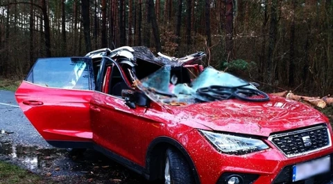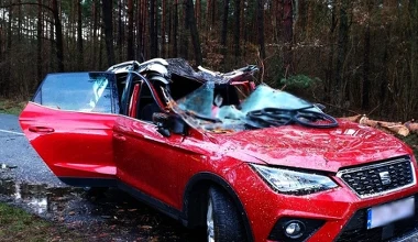 Wichura przewraca drzewo pod nadjeżdżające auto. Jest wideo!