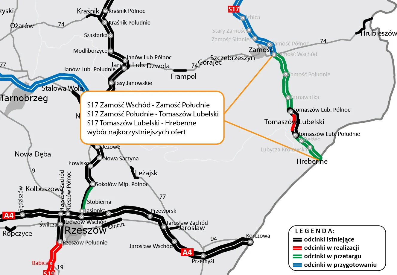 Generalna Dyrekcja Dróg Krajowych i Autostrad wybrała najkorzystniejsze oferty na zaprojektowanie i budowę trzech odcinków drogi ekspresowej S17 od Zamościa do granicy w Hrebennem na Lubelszczyźnie. Łącznie będą miały one niemal 50 km długości.