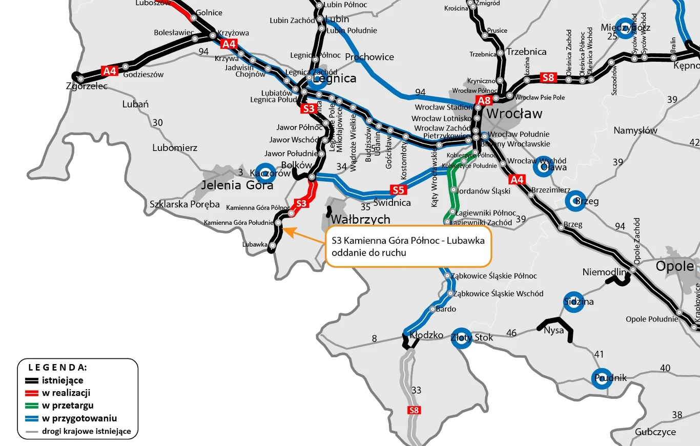 W przyszłym roku udostępniony do ruchu zostanie odcinek Bolków - Kamienna Góra. Do tego czasu wjazd od północy na oddany dziś odcinek będzie możliwy z DK5 na węźle Kamienna Góra Północ. Na kolejnym węźle tj. Kamienna Góra Południe dostępne będą wszystkie relacje dla kierujących. Na ostatnim węźle Lubawka, z uwagi na brak kontynuacji drogi szybkiego ruchu po stronie czeskiej, pojazdy zostaną przekierowane na drogę wojewódzką nr 369 (DW369).