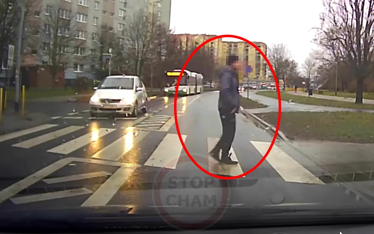 Sam pieszy również wydaje się czujny - nie wchodzi od razu na pasy, tylko zatrzymuje się, upewniając, że samochody zahamują. Tylko co wydarzyło się później?