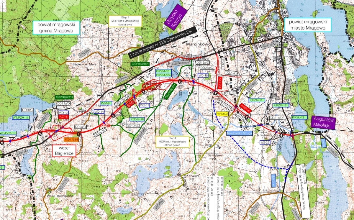 Zadanie o wartości 625 mln zł realizuje firma PORR. Inwestycja jest kolejnym etapem budowy drogi ekspresowej S16 w województwie warmińsko-mazurskim. Nowy odcinek będzie miał długość ok. 16 km, w tym ok. 13 km w ciągu S16 i ok. 3 km obwodnicy Mrągowa w ciągu drogi krajowej nr 59.