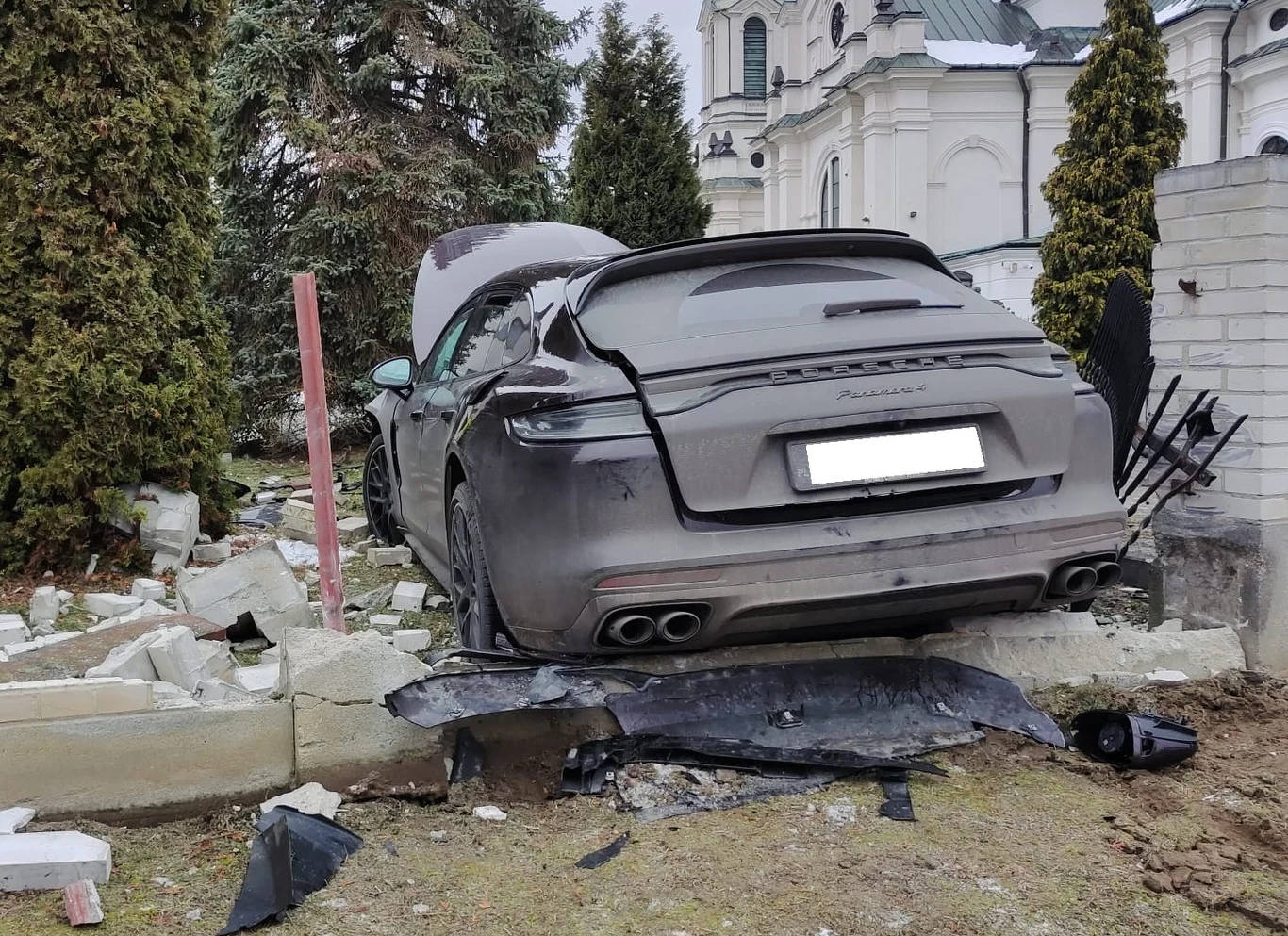 Okazało się, że kierowca Porsche Panamery tak bardzo nie chciał się spóźnić na poranną mszę, że przesadził z prędkością, stracił panowanie nad samochodem, z impetem wbił się w przykościelne, murowane ogrodzenie i dopiero wtedy - z pewnością efektownie - zatrzymał się przed kościołem.