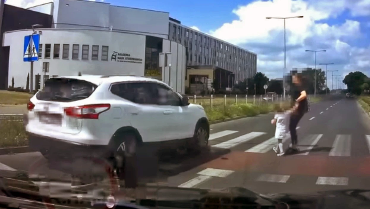 Do groźnego zdarzenia doszło na al. Mickiewicza w Lesznie. Na nagraniu z samochodowej kamery widać, jak matka z małym dzieckiem wchodzą na przejście dla pieszych, wyznaczone przez dwupasmową ulicę.