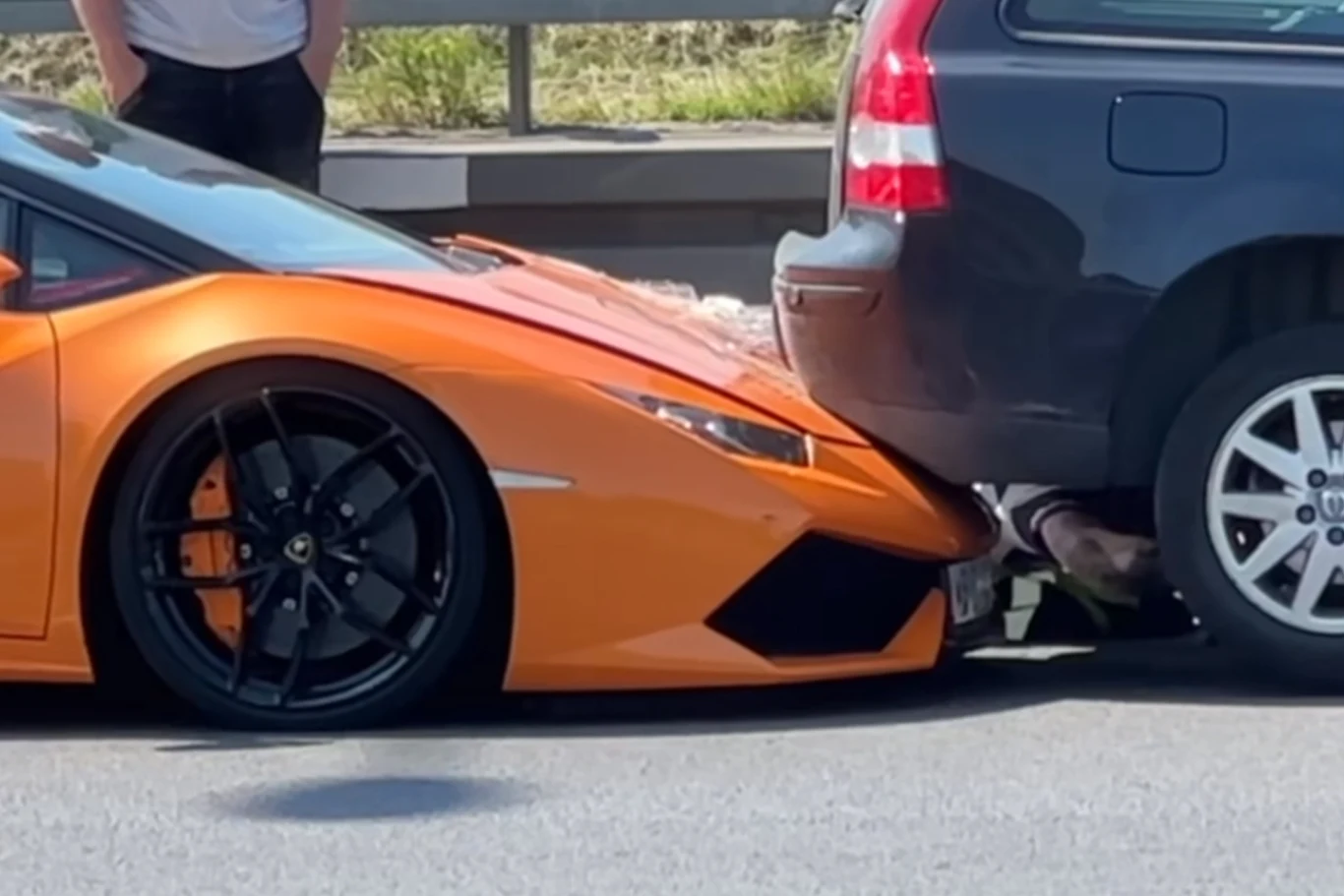 Tym razem na celowniku pomarańczowy kabriolet, który na południowej obwodnicy Warszawy, na wysokości Palucha wsunął się pod zderzak czarnego Volvo. Kierowca Lamborghini Huracan Spyder najprawdopodobniej nie zachował bezpiecznego odstępu od poprzedzającego go auta, Gdy kierowca szwedzkiego kombi zahamował, nisko zawieszony Huracan się pod niego wsunął.