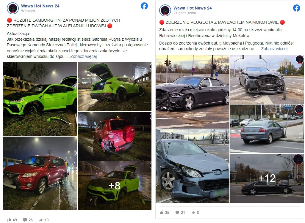 Do pierwszego z tych zdarzeń doszło w piątek na Alei Armii Ludowej. Zderzyły się tam Toyota RAV4 i pochodzące z wypożyczalni Lamborghini Urus. Wytrącone z toru jazdy Lamborghini zatrzymało się na murze oporowym wiaduktu.