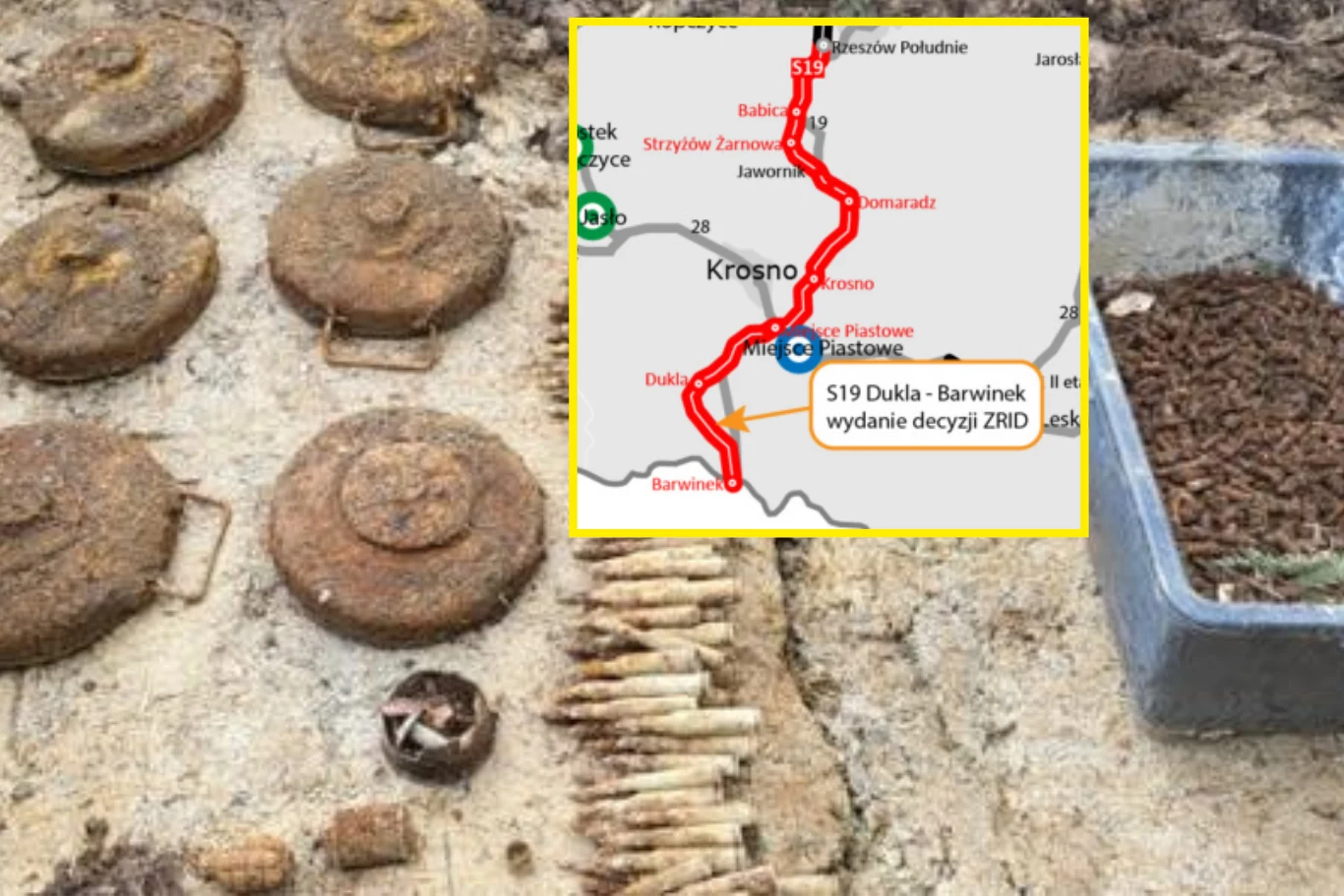 Do potężnego odkrycia doszło na budowie odcinka drogi ekspresowej S19 prowadzącej z Dukli do granicy państwa w Barwinku. Podczas przeprowadzanego rozeznania saperskiego odnaleziono prawie 20 tys. sztuk różnego rodzaju amunicji - wśród znalezisk znajdowało się m.in. 10 bomb lotniczych, 285 pocisków artyleryjskich i 88 granatów moździerzowych. Dodatkowo granaty ręczne, miny, pocisk rakietowy, zapalniki, a także amunicja karabinowa czy lotki granatów moździerzowych.