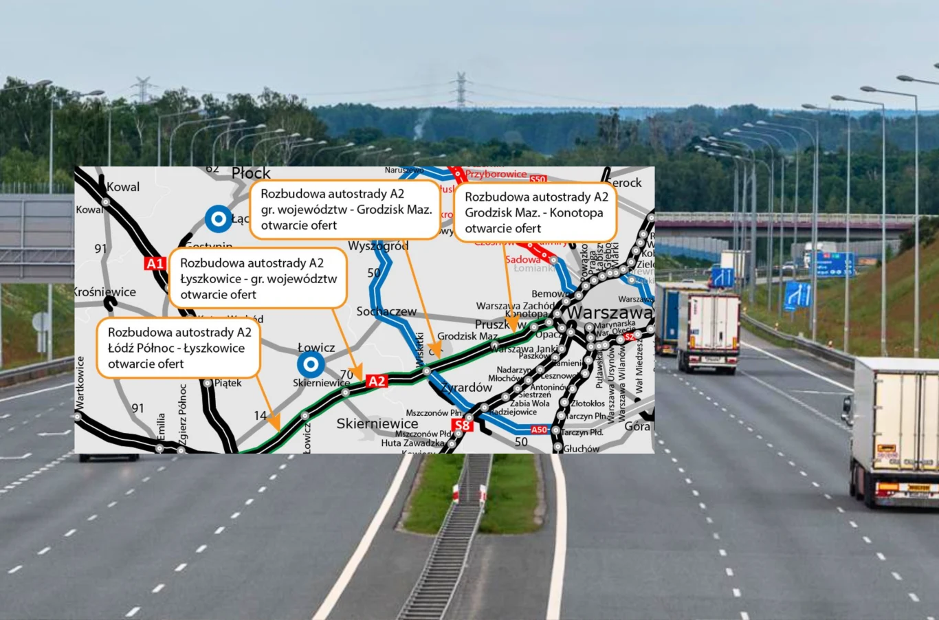 Generalna Dyrekcja Dróg Krajowych i Autostrad poinformowała o wpłynięciu 18 ofert na rozbudowę autostrady A2 pomiędzy Łodzią i Warszawą. Całość zadania podzielono na cztery odcinki. W zależności od fragmentu zgłosiły się od trzech do sześciu firm lub konsorcjów, a wyceny mieszczą się w przedziałach od niespełna 257 mln zł do ponad 512 mln zł. Większość propozycji nie przekracza kwot, które GDDKiA przeznaczyła na realizację prac.