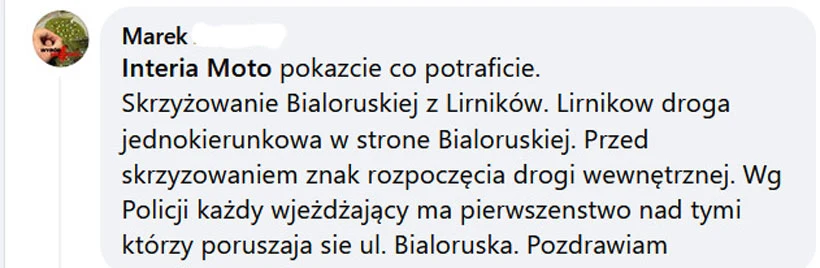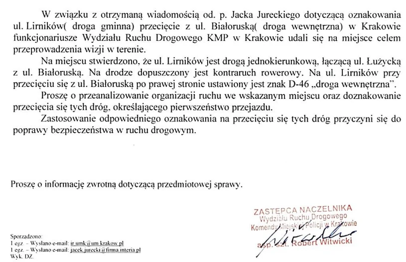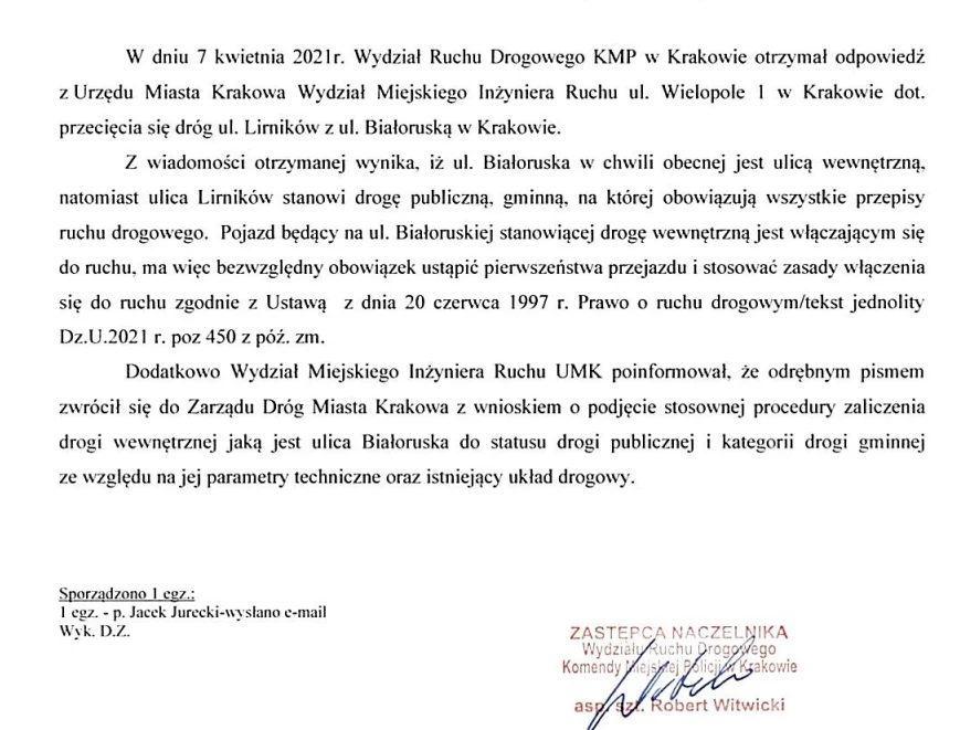 Poniżej odpowiedź jaką policja otrzymała z biura inżyniera ruchu. Ewidentnie wynika z niej, że problemem jest Białoruska, która zaliczona została (pomimo tego że na nią nie wygląda) do kategorii ulic wewnętrznych. Czy Zarząd Dróg Miasta Krakowa zmieni jej status?