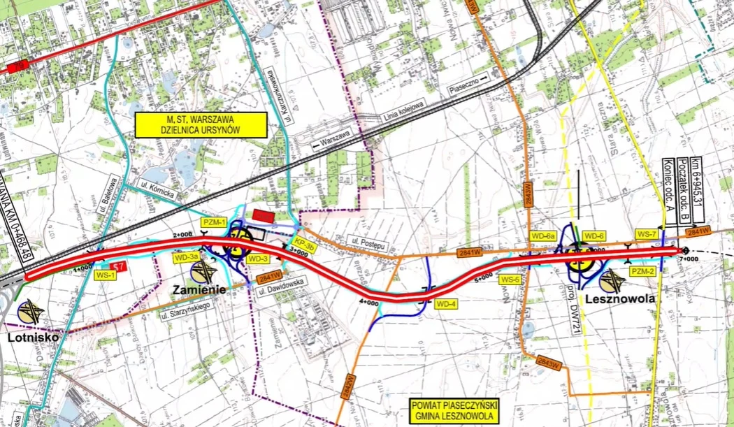 Na tymże węźle kierowcy będą musieli zjechać z trasy na rondo turbinowe u zbiegu ulic Postępu i Krasickiego, bowiem środkowy odcinek trasy S7 na południe od Warszawy, od Lesznowoli do węzła Tarczyn Północ, nadal jest w budowie. Wykonawca powinien zakończyć budowę na jesieni tego roku, jednak na koniec lipca zaawansowanie finansowe prac wynosiło zaledwie niecałe 50 proc.