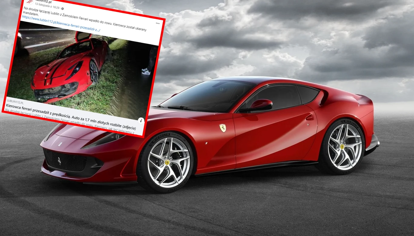 Ale okazuje się, że warszawskie zdarzenie nie było jedynym przypadkiem rozbicia lub przynajmniej poważnego uszkodzenia samochodu Ferrari. Do bardzo podobnej sytuacji doszło w woj. lubelskim, w gminie Fajsławice. 33-letni kierowca Ferrari 812 Superfast jechał drogą krajową nr 17 łączącą Lublin z Zamościem. Na prostym odcinku drogi stracił panowanie nad samochodem, który wypadł z drogi.