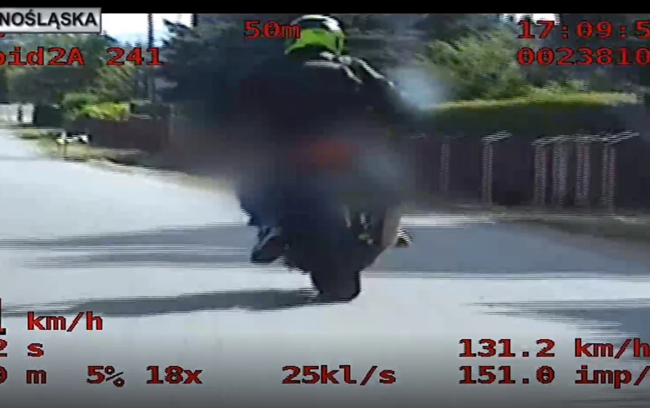 Funkcjonariusze z Referatu Ruchu Drogowego z Komendy Powiatowej w Ząbkowicach Śląskich wyposażeni w wideorejestrator w trakcie służby zauważyli między miejscowościami Starczówek i Niedźwiedź motocyklistę, który z dużą prędkością wyprzedzał samochód. Gdy zbliżyli się do niego rejestrator zapisał prędkość 176 km/h.