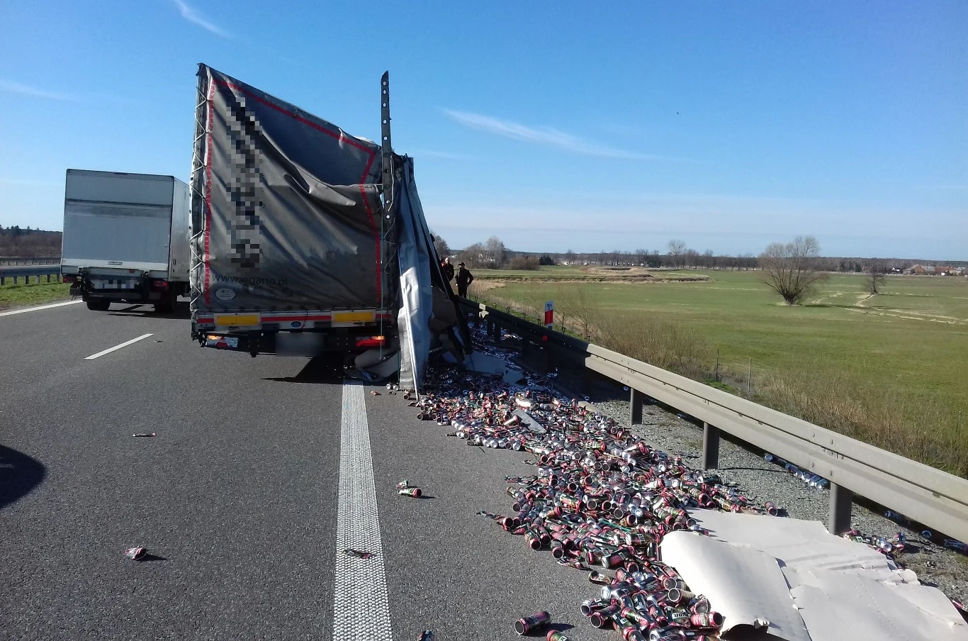Setki puszek po piwie rozsypały się na ekspresowej "piątce" po zderzeniu dwóch ciężarówek.