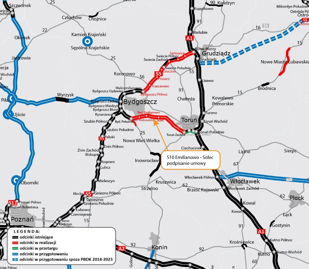Fragment, na budowę którego została właśnie podpisana umowa, razem z innymi pozostającymi w realizacji odcinkami S10, dołączy do już funkcjonujących w województwie kujawsko-pomorskim 24 km wspomnianej drogi ekspresowej.