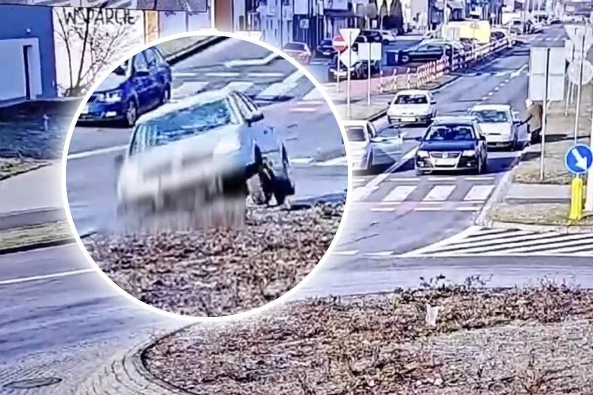 Chwilę potem wjechał na rondo, ale zamiast poruszać się pasem ruchu, pojechał wprost przed siebie. Wjechał na wysepkę i utknął na niej uszkadzając auto. Na jego nieszczęście, zdarzenie zarejestrowała kamera miejskiego monitoringu.