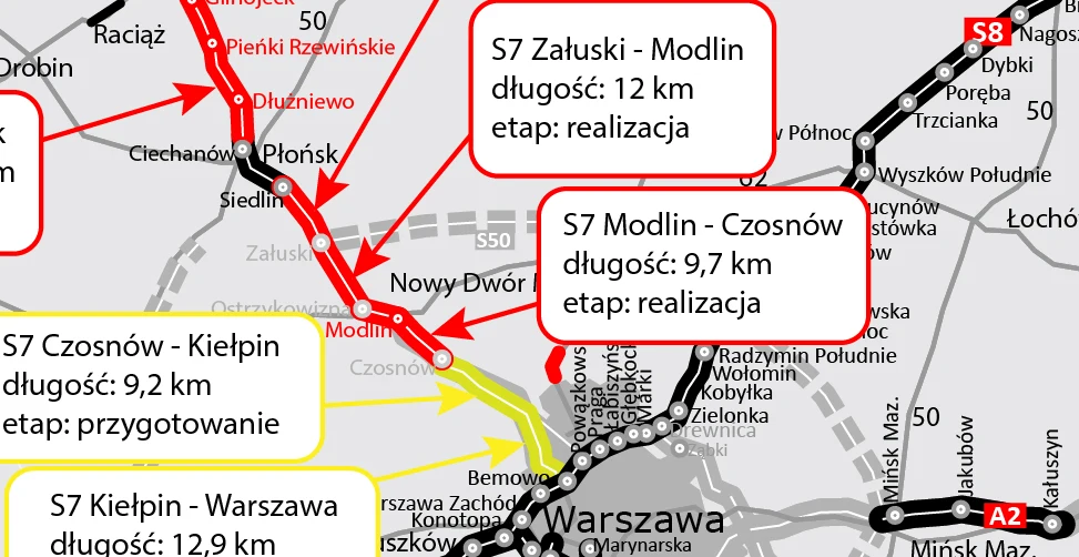 W przygotowaniu jest także S7 Czosnów - Kiełpin - Warszawa (S8). Dla odcinka Czosnów - Kiełpin przygotowywane są dokumenty do ogłoszenia przetargu na zaprojektowanie i budowę trasy. Po przyznaniu środków finansowych zostanie ogłoszone postępowanie przetargowe na realizację zadania. Natomiast dla zadania Kiełpin - Warszawa jest przygotowywana dokumentacja niezbędna do ogłoszenia przetargu na wykonanie projektu budowlanego.