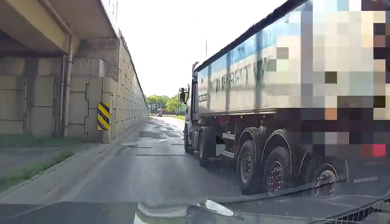 Kierowca ciężarówki zajął więc od razu pas prawy, a kierujący osobówką wjechał na lewy, chcąc skorzystać z okazji wyprzedzenia zestawu. To nie spodobało się kierowcy ciężarówki, który odbił na chwilę w lewo, blokując drogę i stwarzając poważne zagrożenie. Gdyby uderzył naczepą w osobówkę, mogłaby zjechać prosto w ścianę wiaduktu!Po zatrzymaniu na pobliskich światłach, oba pojazdy znalazły się obok siebie. Na nagraniu widać, jak kierowca ciężarówki wychyla się przez otwartą szybę i pluje na osobówkę. Piękne świadectwo wystawił sobie i niestety w konsekwencji też ogólnie kierowcom zawodowym.