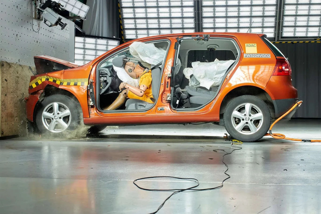 Organizacja ADAC do swojego crash-testu użyła dwóch identycznych VW Golfów V generacji, do których spakowano opony. W jednym zrobiono to za pomocą pasów mocujących, w drugim opony były w żaden sposób niezabezpieczone. Obydwa modele Golfa wjechały czołowo w sztywną barierę w hali ADAC z prędkością 50 km/h.