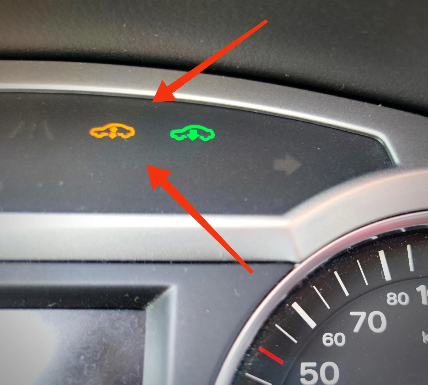 Ta nietypowa kontrolka przypominająca samochód ze strzałką dotyczy awarii wyposażenia tylko niektórych samochodów. Chodzi o auta z pneumatycznym zawieszeniem typu Airmatic, lub Nivomatic. W tym konkretnym przypadku pochodzi z samochodu grupy VAG, ale podobna usterka jest bardzo popularnym problemem w samochodach marki Mercedes.
