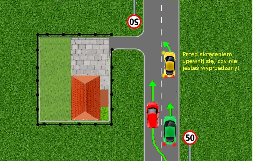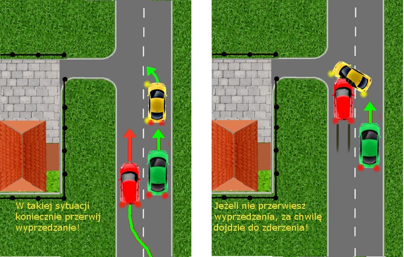 Kierujący czerwonym samochodem rozpoczął manewr wyprzedzania dwóch jadących przed nim aut. Kiedy znalazł się już na lewej połowie jezdni zauważył, że żółty samochód ma włączony lewy kierunkowskaz, sygnalizuje zamiar skręcenia w lewo. Co w takiej sytuacji powinien uczynić kierowca czerwonego samochodu? Natychmiast przerwać wyprzedzanie. Jeżeli będzie je kontynuował, za chwilę dojdzie do zderzenia z żółtym samochodem. Skutki takich wypadków często bywają tragiczne.